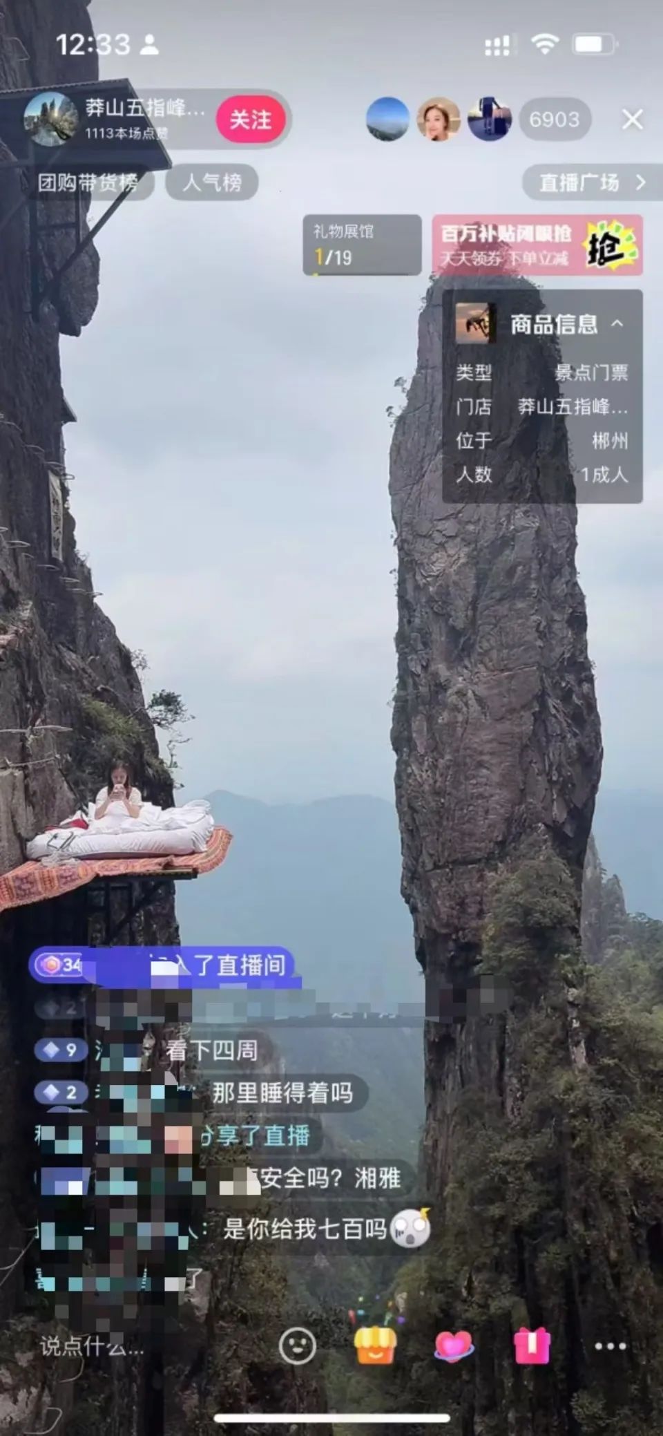 莽山五指峰景区官方账号在进行直播时,主推了悬崖睡床项目,画面显示,一名工作人员坐在睡床上,身上佩戴有安全绳,旁边是悬崖峭壁,当天的直播有近7000人在线观看。